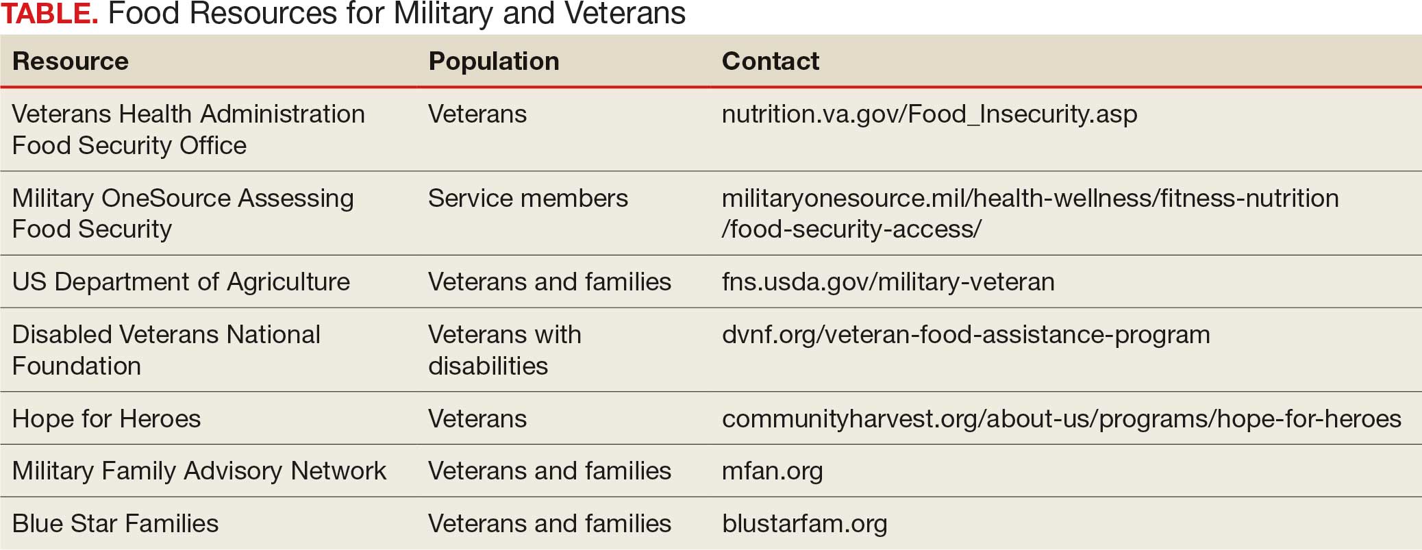 Like many federal practitioners, I was unaware of the food insecurity assistance available to active-duty service members or veterans, or how to help individuals access it. In addition to the resources outlined in the Table, there are many community-based options open to anyone, including veterans and service members.