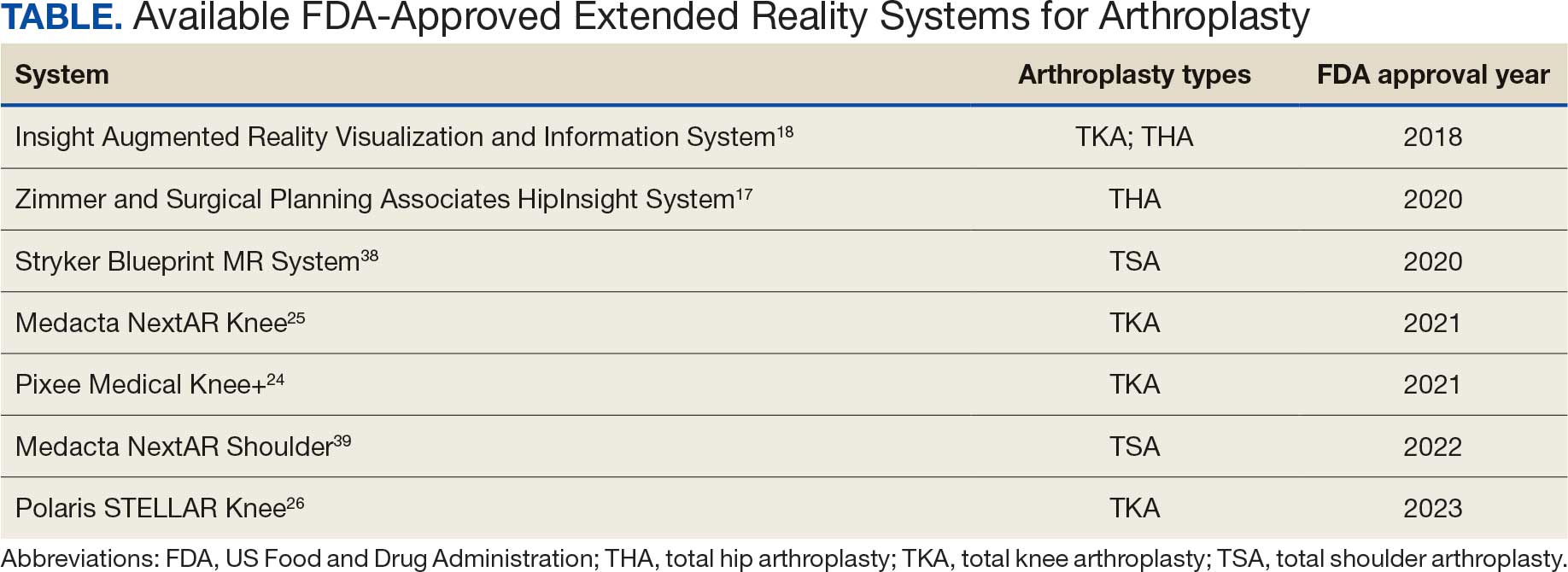 There are some disadvantages to its use, however, including high cost and increased operative time. Despite this, the integration of XR into surgical practice can deliver more precise implant alignment and address other challenges faced with conventional techniques. As these technologies evolve and studies on long-term outcomes validate their utility, XR has the potential to transform the field of arthroplasty.