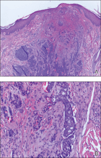 The patient was referred to our dermatology clinic 2 months later for evaluation of a nonspecific dermatitis that had developed at the surgical site on the right side of the neck. Physical examination revealed radiodermatitis on the scar. Additionally, slightly erythematous monomorphic and asymptomatic eruptive papules were noted on the scalp (Figure 1A) and on the left side of the clavicle (Figure 1B). The lesions had developed gradually over 10 days to a diameter of 5 mm. No lymphadenopathy was noted. Due to the characteristics of the lesions (morphology and rapid eruption) and the patient’s medical history, a skin biopsy was performed with a suspected diagnosis of cutaneous metastasis of ACC. The diagnosis was confirmed on histopathologic evaluation, which showed the characteristic features of metastatic ACC with solid areas as shown in Figure 2. Subsequent CT scans of the head, neck, and chest revealed lung and bone metastasis, which had not been present on prior investigation. A few days earlier the patient had developed a productive cough, hemoptysis, and mild dyspnea, which confirmed clinical progression of the disease. The patient was started on palliative chemotherapy and radiotherapy treatment.