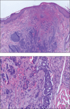 Adenoid cystic carcinoma is a malignant salivary gland tumor characterized by slow yet relentless progression that is plagued by local recurrence, late metastases, and ultimately fatal outcomes.6 It represents approximately 7.5% of salivary gland malignancies.7 Few cases of cutaneous metastases of ACC have been reported on the head and neck as well as the abdomen,8-10 accounting for 1% to 2% of all cutaneous metastases,11 with typical distribution on the head and neck. The presence of distant metastases heralds a poor prognosis in head and neck cancers, with a median survival of 4.3 to 7.3 months.2 Treatment of this patient population usually is palliative. Patients with malignant salivary gland tumors should have a chest radiograph or CT scan at their initial assessment to exclude the possibility of lung metastasis. A higher risk for developing distant metastasis is associated with high-grade tumors such as ACC; salivary duct carcinomas; high-grade mucoepidermoid carcinomas; and tumors located in the submandibular gland, posterior tongue, and pharynx.12 The 3 major growth patterns are tubular, cribriform, and solid. The quantity of solid components is considered to be the most notable indication of a poor prognosis.13-15 In our patient, the site of the tumor—the submandibular region—as well as the presence of histopathologic solid structures suggested a poor prognosis. Our patient presented with eruptive papules on the scalp and on the left side of the clavicle, which was on the opposite side of the primary tumor. In many patients, cutaneous diffusion of the tumor precedes systemic diffusion and therefore can be considered as an early prognostic sign of metastasis.