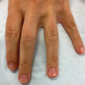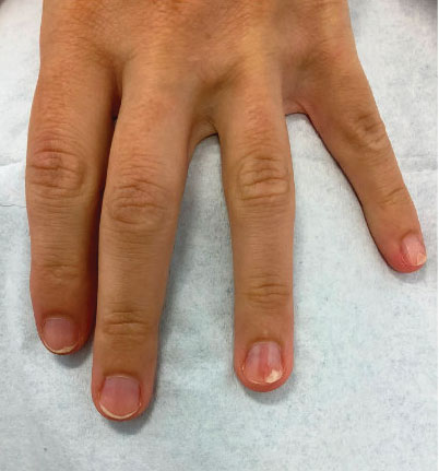 - Lipner SR, Scher RK. Longitudinal erythronychia of the fingernail. JAMA Dermatol. 2016;152:1271-1272. doi:10.1001/jamadermatol.2016.2747