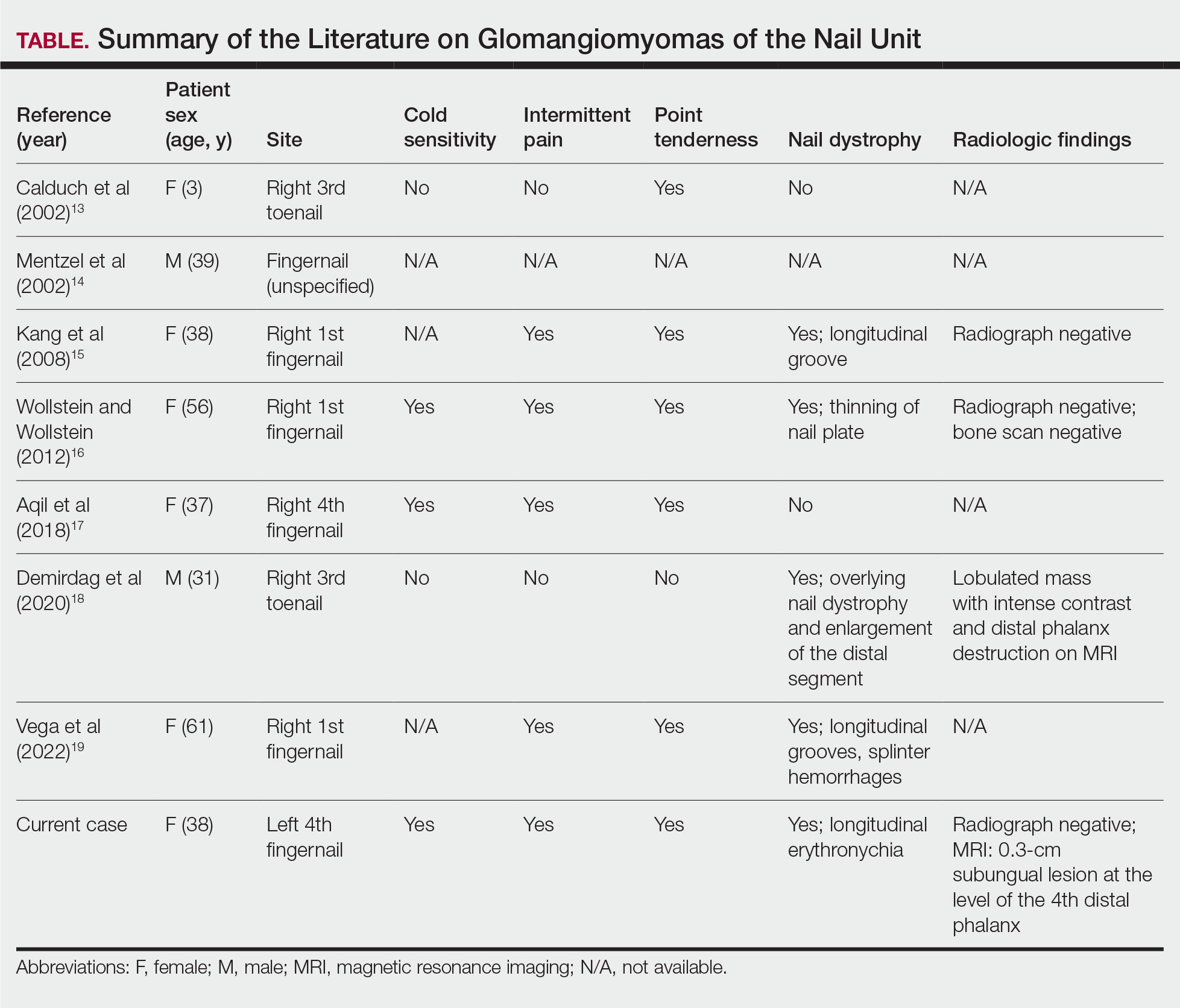 - Dhami A, Vale SM, Richardson ML, et al. Comparing ultrasound with magnetic resonance imaging in the evaluation of subungual glomus tumors and subungual myxoid cysts. Skin Appendage Disord. 2023;9:262-267. doi:10.1159/000530397
