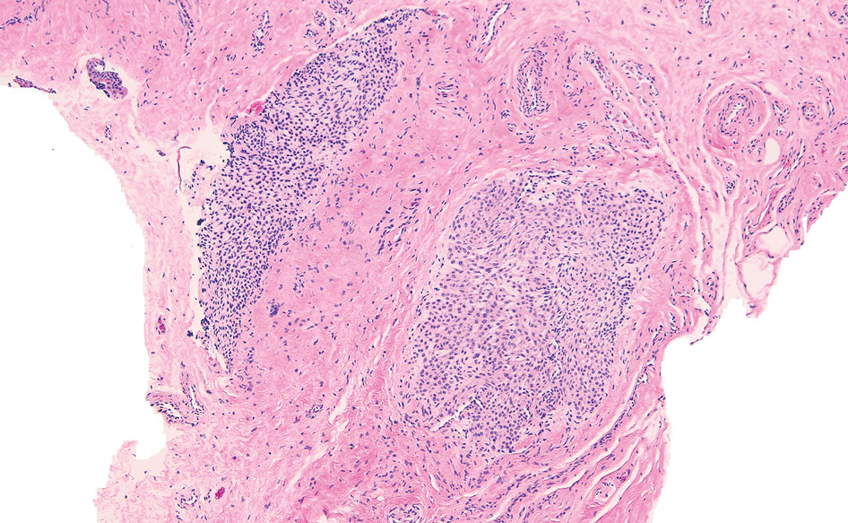 The nail unit excision specimen showed collections of cuboidal cells and spindled cells within the corium that were consistent with a diagnosis of a glomangiomyoma, a rare glomus tumor variant (Figure). Glomus tumors are benign neoplasms comprising glomus bodies, which are arteriovenous anastomoses involved in thermoregulation.1 They develop in areas densely populated by glomus bodies, including the fingers, toes, and subungual areas. Glomus tumors most commonly develop in middle-aged women.2 Clinically, they manifest with a characteristic triad of intense pain, point tenderness, and cold sensitivity and may appear as reddish-pink or blue macules under the nail plate and/or longitudinal erythronychia.2-6 The presence of multiple glomus tumors is associated with neurofibromatosis type 1.7