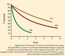 The Southwest Oncology Group (SWOG) study 8805 used a trimodality approach in patients with bulky stage III NSCLC: induction chemoradiation with concurrent cisplatin, etoposide, and radiotherapy (45 Gy) followed by surgical resection.4 The 3-year survival rate with this treatment strategy was 26%. Patients in this trial who were downstaged following induction therapy so that they had node-negative disease at the time of surgery had a superior prognosis, with a 3-year survival rate of 41%. Therefore, a subset of patients with stage III NSCLC stands to benefit from surgery, but identifying this group prior to surgery may not be possible.