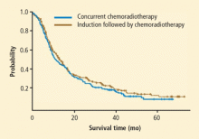 Figure 1. At median follow-up of 38 months among patients with non–small cell lung cancer, there was no statistically significant difference in median survival between those randomized to immediate concurrent radiotherapy and those who received induction chemotherapy followed by identical chemoradiation (12 months vs 14 months, respectively).Induction chemotherapy followed by chemoradiation was proposed as an alternative to concurrent chemotherapy as a way to potentially improve systemic control in patients with unresectable stage III NSCLC. Induction chemotherapy provided no survival benefit over concurrent chemoradiation alone in a randomized controlled comparison by Vokes et al (Figure 1).13 There was no significant difference in nonhematologic toxicity between the treatment groups, although the incidence of grade 3/4 esophagitis was very high (about 30%) in both arms. The patient selection may have influenced median survival in this trial; approximately 25% of patients enrolled had weight loss in excess of 5%, which has been shown to be a poor prognostic factor.