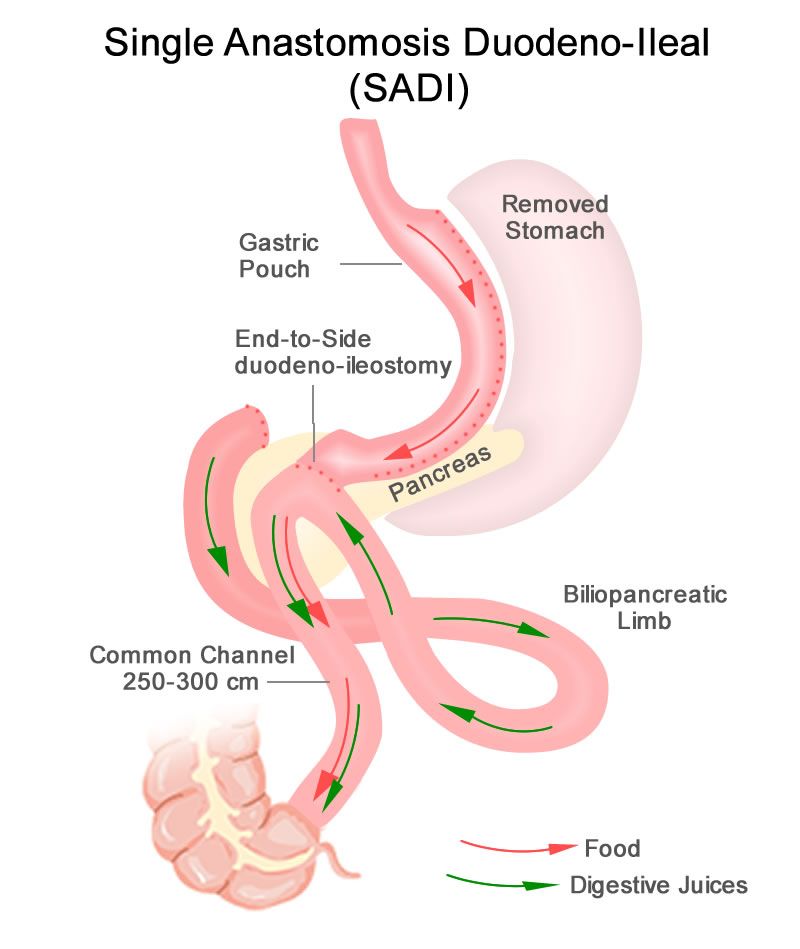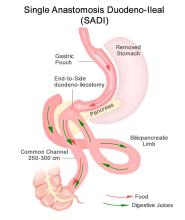 Roux-en-Y gastric bypass is a restrictive and malabsorptive procedure, resulting in 30-35% TBW loss. It has beneficial and immediate metabolic effects, including increased release of endogenous GLP-1, which leads to improvements in weight-related T2DM. The newer single anastomosis duodenal-ileal bypass with sleeve gastrectomy (SADI-S) starts with a sleeve gastrectomy, making a smaller tube-shaped stomach. The duodenum is divided just after the stomach and then a loop of ileum is brought up and connected to the stomach (see Figure 1). This procedure is highly effective, with patients losing 75-95% of excess body weight and is becoming a preferred option for patients with greater BMI (≥50kg/m2). It is also an option for patients who have already had a sleeve gastrectomy and are seeking further weight loss. Because there is only one anastomosis, perioperative complications, such as anastomotic leaks, are reduced. The risk of micronutrient deficiencies is present with all malabsorptive procedures, and these patients must supplement with multivitamins, iron, vitamin D, and calcium.