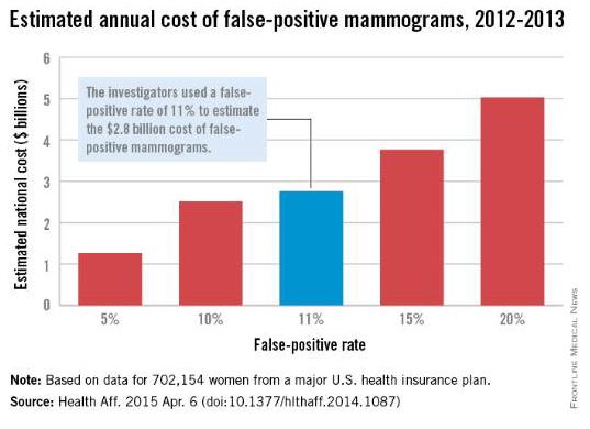 Using expenditure data for 702,154 women from a major U.S. health care insurance plan, the investigators calculated that the average cost of a false-positive mammogram – the mammography plus all related costs over the next 12 months – was $852. The average 12-month costs for invasive breast cancer and DCIS were $51,837 and $12,369, they reported (Health Aff. 2015 Apr. 6 [doi:10.1377/hlthaff.2014.1087]).