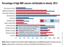 Of all new cancer cases diagnosed worldwide in 2012, 3.6% or 481,000 of the cases were attributable to obesity, reported Melina Arnold, Ph.D., of the International Agency for Research on Cancer, Lyon, France, and her associates. In North America, 20.8% of high-BMI cancers in men and 19.2% in women were attributable to obesity, Dr. Arnold and her associates estimated. The next-highest of the 12 regions in the study were Northern Europe for men (18.3%) and Eastern Europe and the Middle East/North Africa for women (both 18.2%),