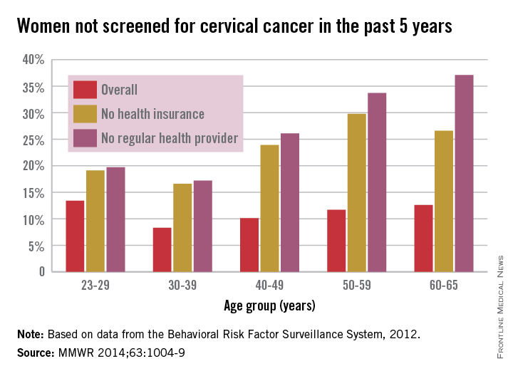 In 2012, an estimated 11.4% of U.S. women aged 21-65 years had not had a Pap test to screen for cervical cancer in the past 5 years, compared with 25.5% of women without a regular health care provider and 23.1% of those without insurance, the CDC reported (MMWR 2014;63:1004-9).