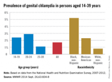 The prevalence of chlamydia infection for all women aged 14-24 years was higher than the national average, despite being “the population targeted for routine screening” of the disease, the CDC said. The overall rate of chlamydia prevalence in women aged 14-24 years was 4.7%, with non-Hispanic blacks reporting a prevalence of 13.5%, Mexican-Americans of 4.5%, and non-Hispanic whites of 1.8%.