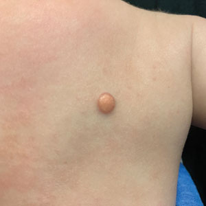 A 6-month-old male infant with a history of cradle cap and an infantile hemangioma on the left shoulder presented to the dermatology clinic for evaluation of a slow-growing yellow papule on the upper back of 3 months’ duration. The lesion initially was noted 2 months prior to the current presentation by the patient’s pediatrician, who recommended follow-up with dermatology after an unsuccessful attempt at incision and drainage. Physical examination revealed a 7-mm, yellow, dome-shaped papule with a red collarette on the right upper back. No axillary freckling, ocular findings, or other skin findings were found. The patient was born at term with no complications, and his mother reported that he was otherwise healthy. There were no developmental concerns or known allergies, and his family history was negative for any similar lesions. Dermoscopic examination of the lesion revealed a well-circumscribed, circular, yellow-orange papule with an erythematous border and setting-sun appearance.